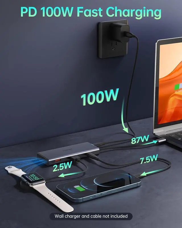 Efficient Charging HubThis dual HDMI docking station is equipped with a USB-C PD charging port, capable of handling up to 100W charging input, and it can deliver up to 87W of power to your Type-C devices. In addition, its USB-A and USB-C ports, apart from offering data transfer speeds of up to 10Gbps, can also provide up to 7.5W of power, suitable for charging phones and smart watches. (Note: The docking station does not come with a charger or USB-C charging cable. )