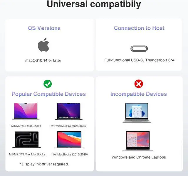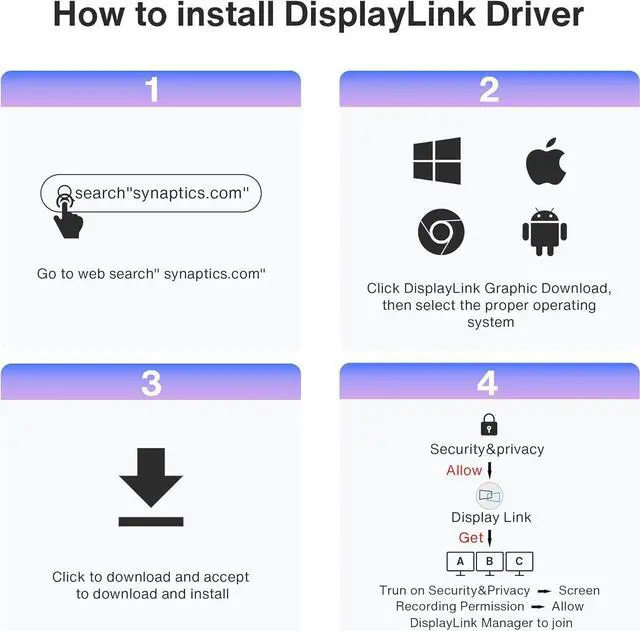 DisplayLink DRIVER NOTEFor the normal operation of this 14-in-1 docking station, please install the corresponding DisplayLink driver version before running your devices; the HDMI 2 & 3 ports only work when the proper driver is installed for your dock