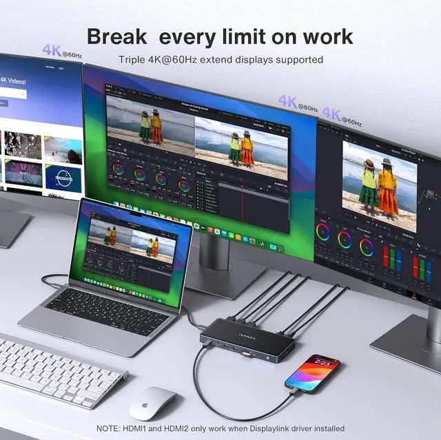 Triple 4K@60Hz DisplaysAfter installing the proper driver for the dock, you enjoy a wonderful triple monitors experience. All the three HDMI ports support up to 4K@60Hz and can be converted into VGA and DVI output by using an appropriate adapter or cable