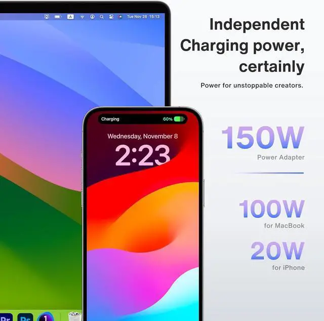 Lightning-Fast ChargingThis dock features three USB-C ports that can all be used for charging. One 150W power adapter enables this docking station to efficiently charge laptops up to 100W via its upstream USB-C port and USB-C devices up to 20W via its PD port