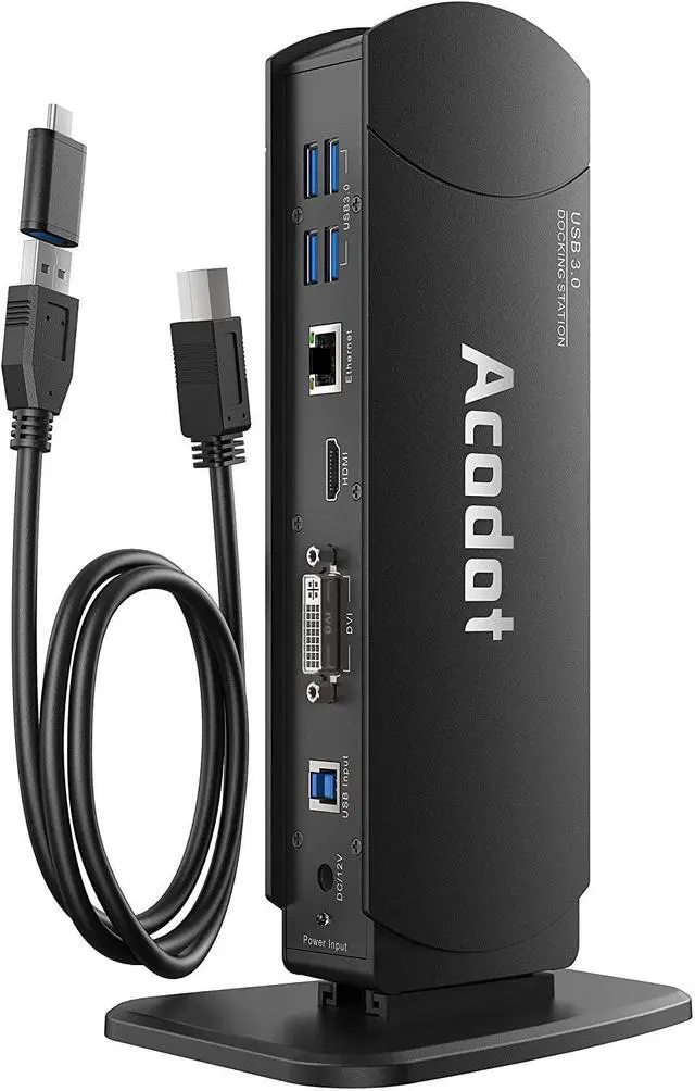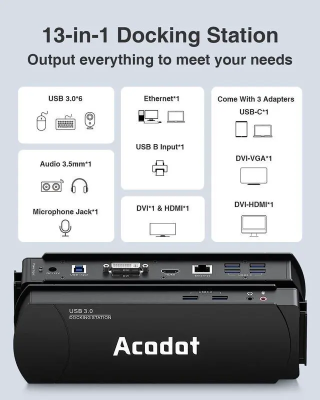 13-in-1 USB Docking StationAcodot USB dock designed with 13 ports included Ethernet, HDMI, DVI, 6x USB 3.0, PC/host, power input, headphone and microphone. All in one meets the needs of your tedious work, making your work and life more convenient.
