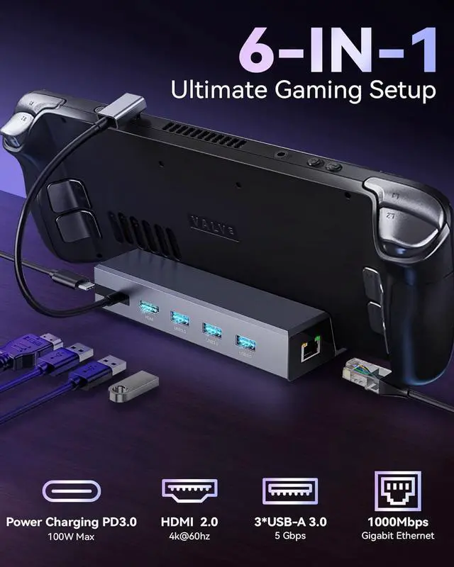 Steam Deck Docking Station: Integrated with an HDMI 2.0 output (4K@60Hz), three USB-A 3.0 ports (each 5Gbps), one hyper speed (1Gbps) Ethernet input, and a USB-C PD 3.0 port (100W) for charging, allowing you to get the best gaming experience out of your steam deck and other consoles.
