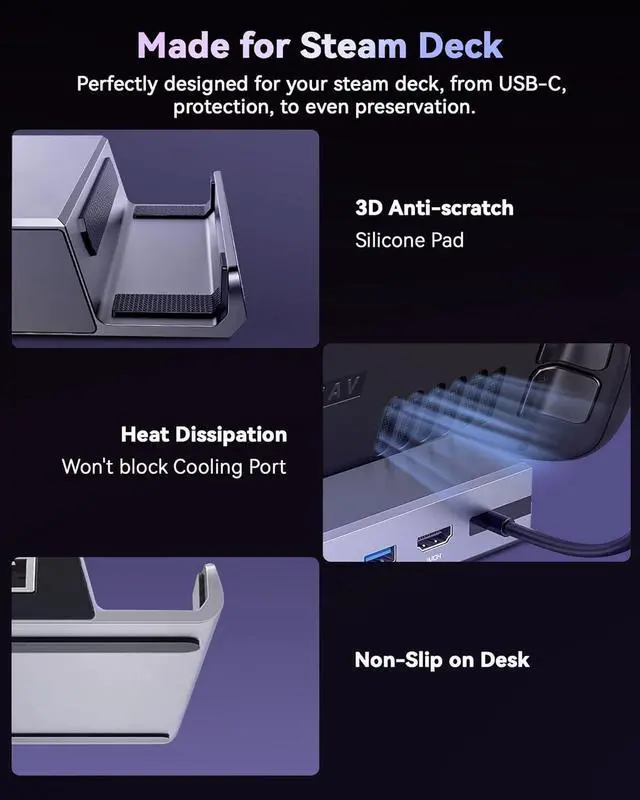 Compatibility- Our valve steam deck docking station is not just compatible with a Steam Deck but also connectable with iPads, Macs and Android phones, and laptops with USB-C ports. NOTENot-compatible with AYA NEO console or Protective Case with Kickstand over 2mm.