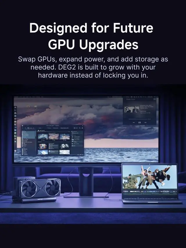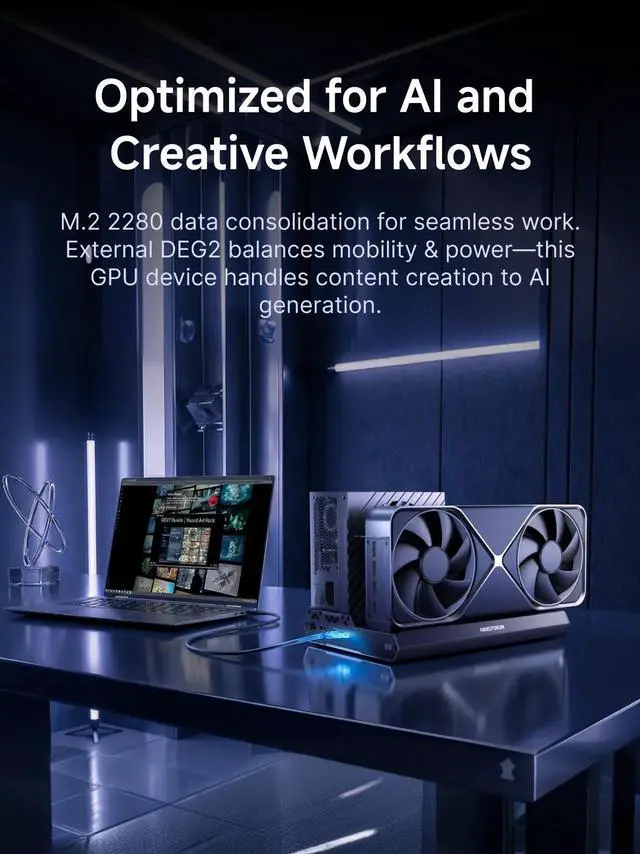 Optimiz WorkflowsDEG2 stores models/assets/project files on its internal M.2280 for faster GPU access. Heavy GPU tasks run on its desktop graphics card; ultrabook handles control/display, ensuring mobility without sacrificing power. Rendering, editing, and AI run on this single GPU, minimizing file transfers and streamlining workflow.