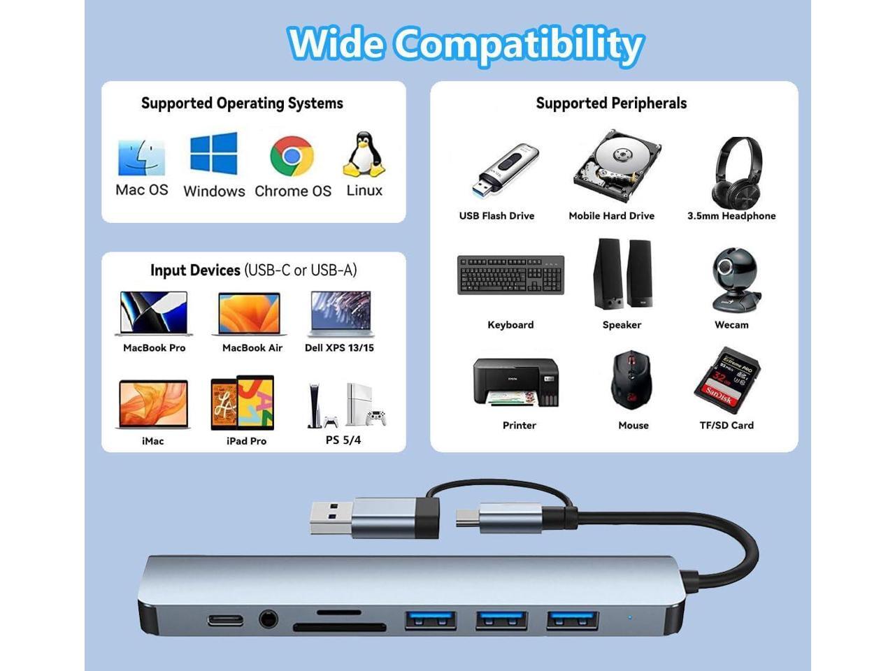 - Versatile USB Hub Extender:Instantly expands your USB-C or USB female port into 7 essential ports, including USB jacks, SD/TF card slots, a 3.5mm audio jack, and a USB-C port for enhanced connectivity