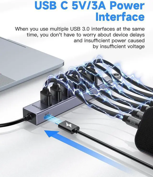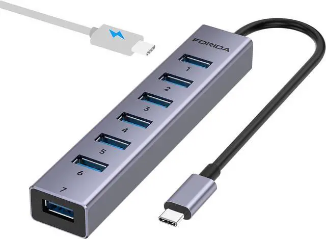 • 7 USB 3.0-Port Hub-FORIDA USB C HUB turns one USB port into Seven, support for USB Flash drive, Mouse, Keyboard, Printer, or any other USB Peripherals. And it's backward compatible with your older USB 2.0 / 1.0 devices.