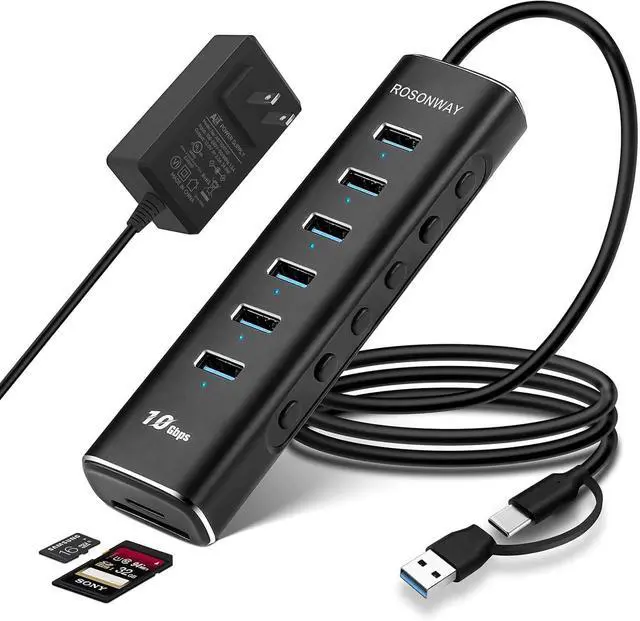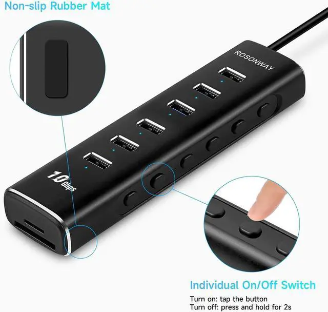 Hub: Rosonway 8 Ports USB hub with 6 USB 3.1 / 3.2 gen 2 ports, provides file transfer at speeds up to 10 Gbps, twice the data transmission rate of conventional USB 3.0 in theory. USB 3.1 / 3.2 Gen 2 hub supports the USB 3.2 NVMe SSD, Flash Drive and more. Backward compatible with USB 3.0 and USB 2.0 devices