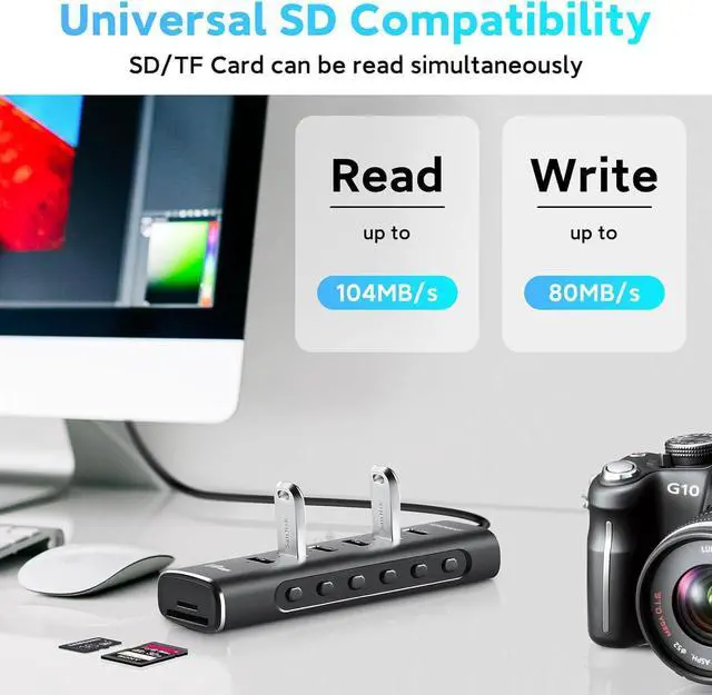 SD/TF Card Reader: USB C hub splitter built-in SD and TF slots for easy access to files from SD and Micro SD cards, Read speeds of up to 104MB/s and write speeds of up to 80MB/s. Support 2 cards to read and write at the same time, compatible with SD, SDHC, SDXC; Micro SD, Micro SDXC, Micro SDHC memory cards. Perfect for photographers or designers, etc