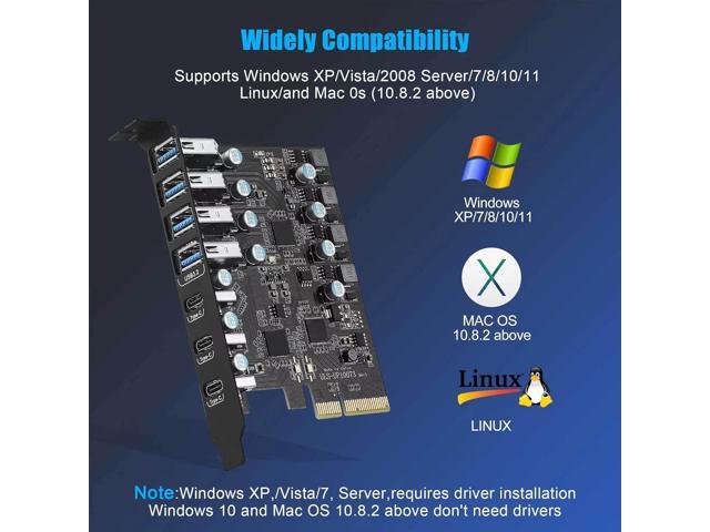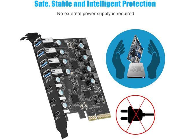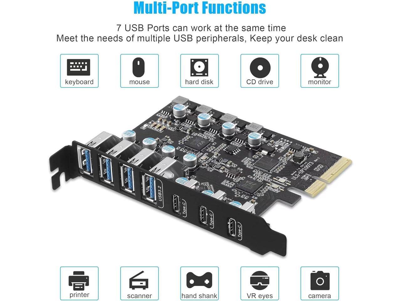 - 7-Ports Expansion CardFanblack PCI-E expansion card provides 7 external USB 3.2 Gen 2 Ports (4 USB Type-A and 3 USB Type-C Ports) for your computer. You can connect a keyboard, mouse, external hard drives, CD/DVD drives, webcams, USB printers, scanners, game controllers, USB VR, digital cameras, etc
