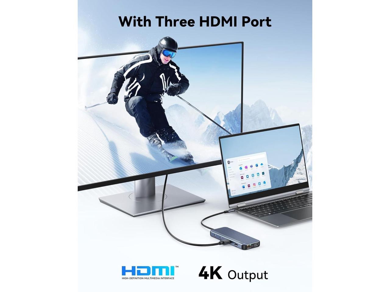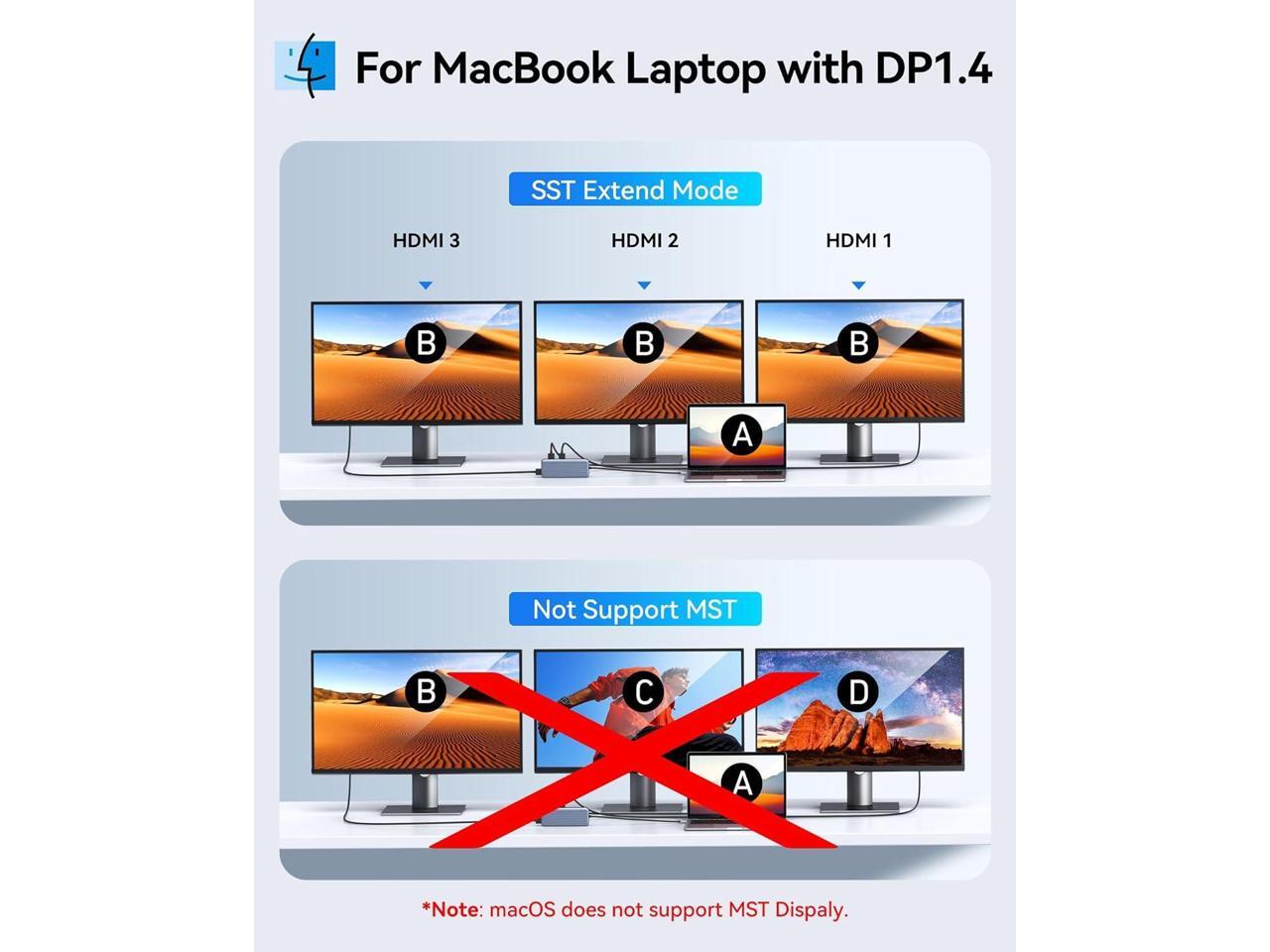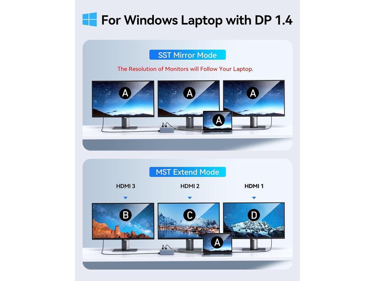 - Docking Station 3 Monitors12 in 1 Triple Display Docking Station allows you outputting triple display. WINDOWS mirror mode:All HDMI output resolution will follow your laptop, WINDOWS extend mode:HDMI 1 + HDMI 2 + HDMI 3 display Display three different screens simultaneously. MAC OS:M1 and M2 Chip Supports displaying three identical screens.(All of the above mode is based on DP1.4 laptop and monitor