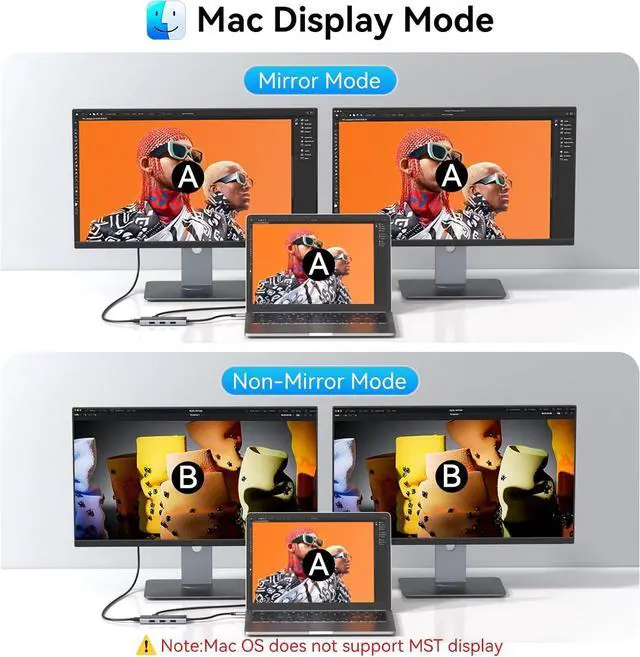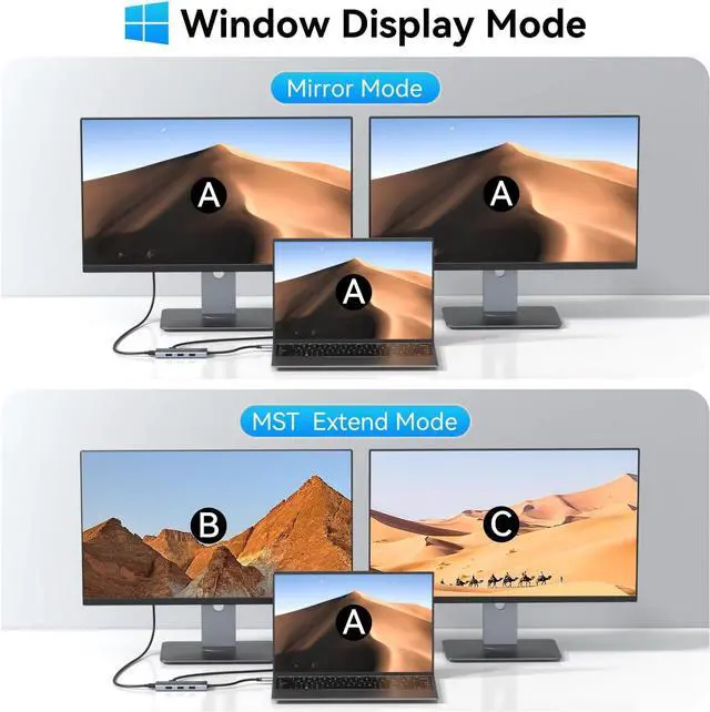 Dual 4 K HDMI Monitor Docking Station: USB C Hub with 2 HDMI port use HDMI port to enter mirror mode for usb c laptops or extended mode and transfer 4 K 60 Hz HD video with 3D effect from laptop screen to a monitor, projector, HDTV, etc. Support both SST and MST mode. Support dual display for your windows laptops. 2 HDMI ports can be used simultaneously, resolution up to 4 K 60 Hz. Please note that if you use it to connect macbooks, it only support mirror mode without extended mode