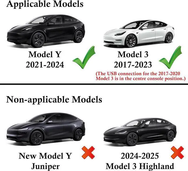 Upgrade Your ExperienceOur glove box docking station is only applicable to Model Y 2021-2024 and Model 3 2021-2023. Use glass black colors, slim, no needless logo printed, the shape and glove box arc fit, let it install it inconspicuously in the glove box. Super simple upgrade that looks like it came from the factory interior accessory. Please Note that it Not Compatible with 2024-2025 Model 3 Highland, Cybertruck, New Model Y Juniper