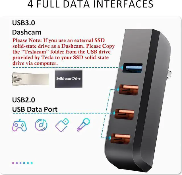 4-in-1 Multi PortsConvert the original car from one glove box USB-A port to four USB-A ports. One USB 3.0 port and three USB 2.0 ports. The USB 3.0 blue port is suitable for driving recorders. It is compatible with external Dashcam and supports the use of up to 2TB SSD solid-state drives. The other three 2.0 interfaces are suitable for charging, listening to music, playing games, and flash drives, and can be used simultaneously without worrying about car system alarms.