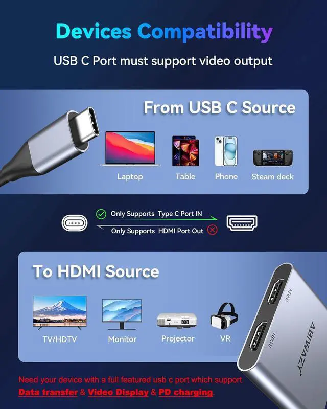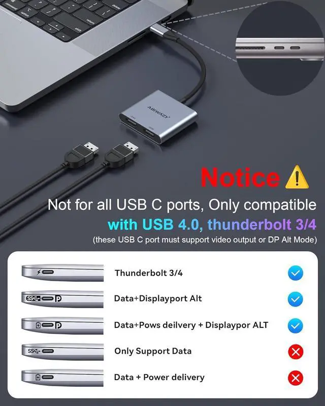 Wide Compatibility: NOTE!!! Before you purchase, PLEASE ENSURE the USB-C port of your laptop support video output or DP Alt Mode, which decides the HDMI port work or not. This hdmi dual monitor adapter works well with
