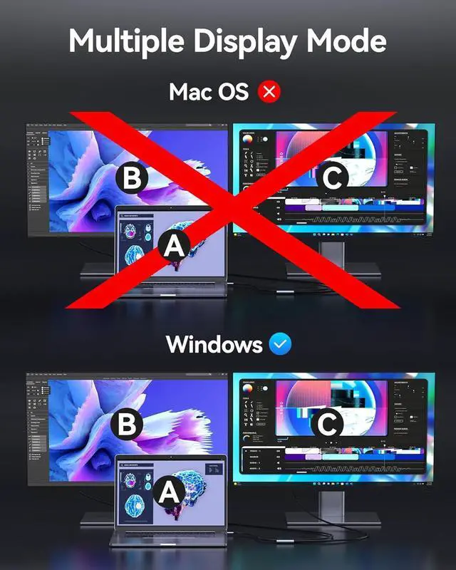 USB-C to Dual 4K HDMI Adapter Hub 2 in 1: Attention!!! Mac OS ONLY support Mirror Mode(A-AA, A-BB), Can' t extend two different Screen, due to Mac OS limitation. The dual monitor adapter expend your laptops FULL-FTEATURED USB C Ports into 2 hdmi port 4K@60Hz. You can enjoy movies, games with your families on external ultra HD big screen; Windows OS supports both SST and MST mode, if you not sure how to setting, please let us know, or download the user guide in Product information->Product informat