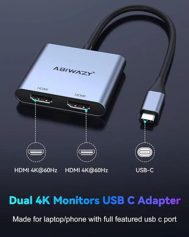 What you get: 1* USB Type C 2 HDMI Adapter, 1* User Manual. If the monitor of your laptop is not enough space to complete the work, then this usb-c dual hdmi will be an ideal choice! At ABIWAZY, we offer 1-year defective product replacement and friendly customer service; If there is any problem with this Dual HDMI Monitor Converter, please et us know your concerns, we Provide 12 months service+ technical support + Friendly after-sales service within 24 hours