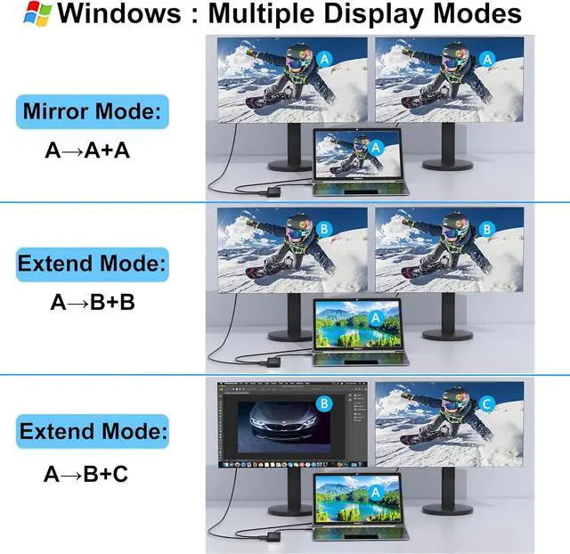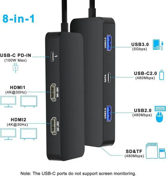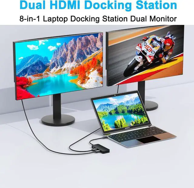 Computer Docking Station for Laptops Dual Monitor: The USB C Dual HDMI adapter with 2 HDMI ports, allow your USB C laptops to extend 2 different monitors, no need any drivers or software, just plug and play. Support both SST and MST mode. 2 HDMI ports can be used simultaneously, resolution up to 4K@30hz.