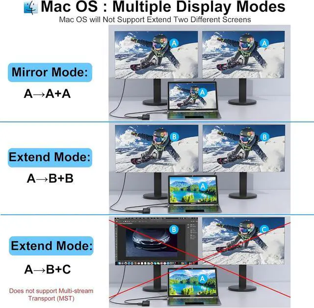 SST(Mirror Mode: display the SAME image) due to the MacOS limitation. Windows support MST (Extend Mode) and SST (Mirror Mode).