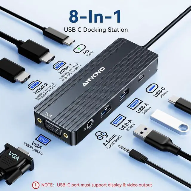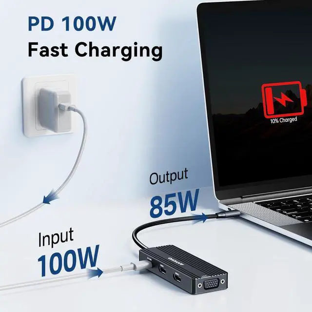 100W Power Delivery: The ANYOYO USB-C Docking Station Supports USB-C Power Delivery for 100W input and 85W output, suitable for all your high-demand technology. (Note: A 100W PD wall charger and a USB-C to USB-C cable are required for maximum charging efficiency. )