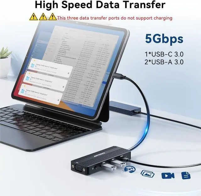 High-Speed 5Gbps Data Transfer: Experience lightning-fast data transfers with the ANYOYO USB-C Docking Station, featuring 5Gbps speeds on both the USB-C and USB-A ports. This rapid transfer rate allows you to quickly move large files, stream high-definition content, and connect multiple devices without lag. Whether youre transferring data or backing up important files, enjoy a smooth and efficient workflow that reduce wait time and enhance productivity.