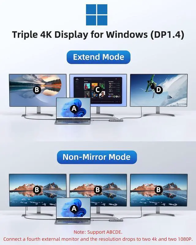 Quadruple Display Docking StationThis usb c docking station only Windows System support MST and SST(Mirror & Extend Mode), HDMI port support up to 4K@60Hz (DP 1.4 Source); DP port support up to 4K@60Hz.