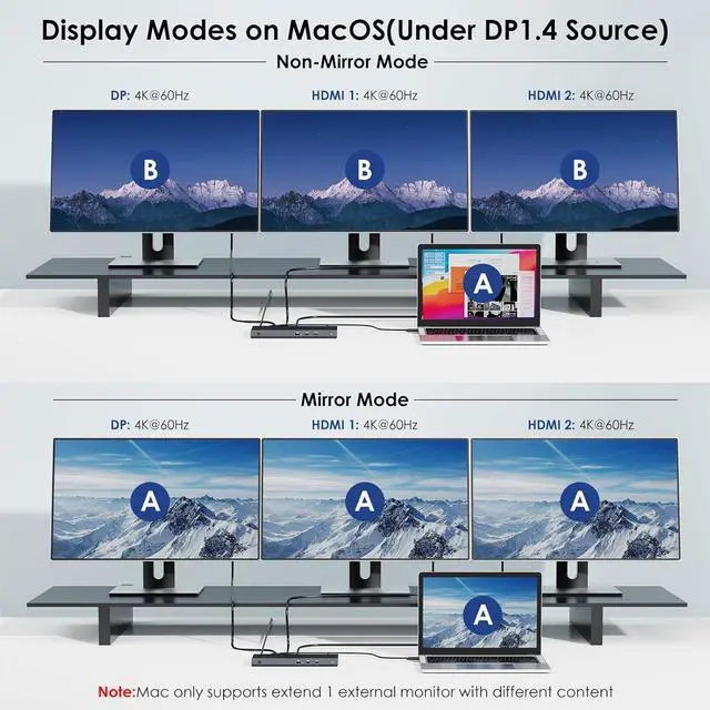 8K Ultra HD & Triple Display: Take your visual experience to the next level with our USB C dock. Equipped with dual HDMI and DP ports, it supports up to triple 4K@60Hz video output for Mac users (Under DP 1.4 ). Single 8K@30Hz is only available for Windows PC via the DisplayPort. Ideal for video editors, image designers, game players etc.