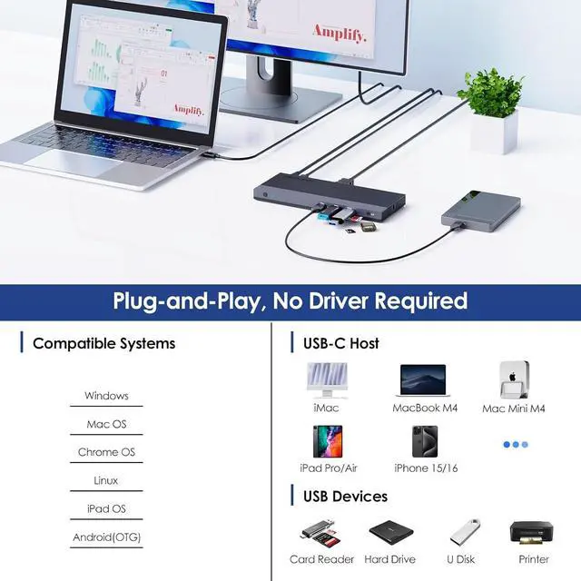 Wide compatibility: Widely compatible with Windows 11/10/ 8.1 /8/7, Mac OS, Chrome OS, Linux, iPad OS, Harmony OS, Android with OTG function, iOS. Suitable for your Thunderbolt 3/4/5 laptops or devices with USB-C port that supports charging and video output (Check the details page or contact our customer service to see more compatible devices). No driver required, get rid of hassled driver installation, just plug and play