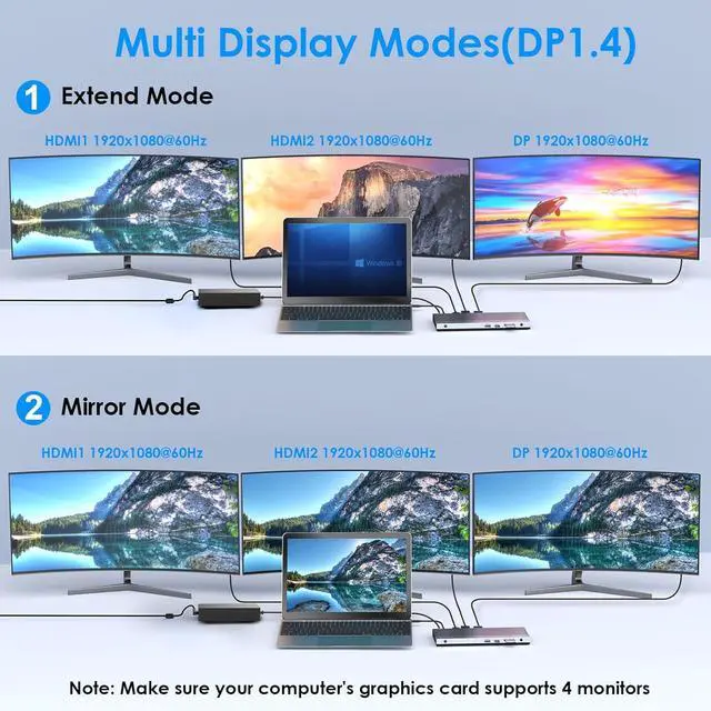 13-in-1 USB C Laptop Docking Station Triple Monitor & Dual HDMI Support. Expand your laptop into a workstation with 2x HDMI 4K@60Hz + 1x DisplayPort 4K@60Hz, 3x USB 3.0 (5Gbps), Gigabit Ethernet, SD/TF card readers, and 100W PD charging. Perfect for dual monitor or triple screen setupsconnect all peripherals via a single USB-C cable.