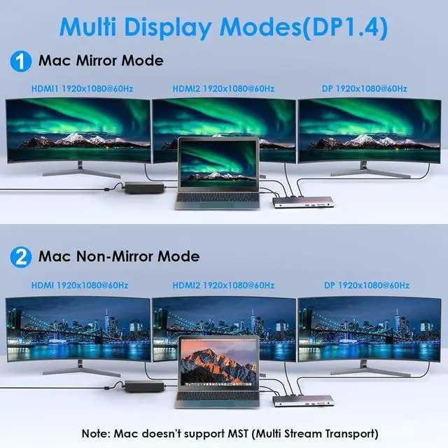 Mac: Mirror displays or show the same content on all monitors. *Compatible with Thunderbolt 3/4 and USB-C laptops (DisplayPort Alt Mode). *