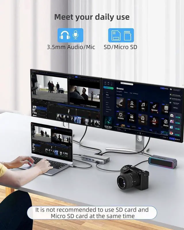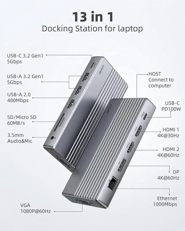Connectivity Powerhouse: This high-performance usb docking station encompasses a universe of features -a USB-C to USB hub, an SD card reader, an Ethernet adapter, a multiport adapter, dual HDMI ports, a DisplayPort (DP), a VGA port, a 100W Power Delivery (PD), four USB-A ports, and a 3.5 mm audio port. It' s your ultimate solution, designed to cater to all your connectivity demands and streamline your work-life journey.