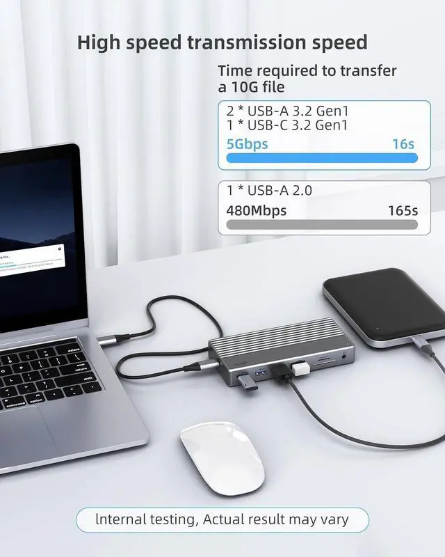 Lightning-Fast Charging Experience: Featuring a powerful 100W USB-C PD port, the laptop dock charges compatible devices quickly and efficiently. Whether transferring large files, streaming media, or working, devices get charged rapidly, ensuring no work interruptions due to low battery. Stay charged up and productive at all times, without any battery life concerns.