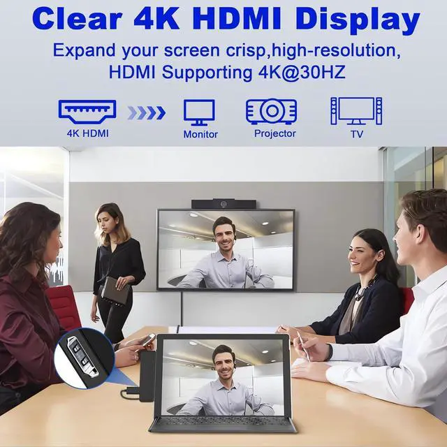 ports: USB-C Thunderbolt 4 (8K@30Hz video display + 40 Gbps data transfer + 100W PD charging) 1x4K@30Hz HDMI port, 2 USB 3.0 ports, 1 SD card slot, 1 TF (Micro SD) card slot, 1 audio port*. 3.55 mm. 6 ports can be driven and used at the same time. Can be used to drive projection, mobile phone, USB data transfer, card reader, charging and other devices (mouse, keyboard, audio, etc. )