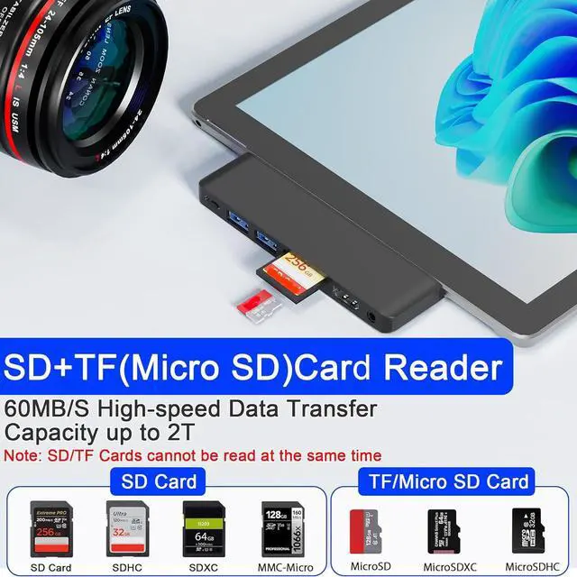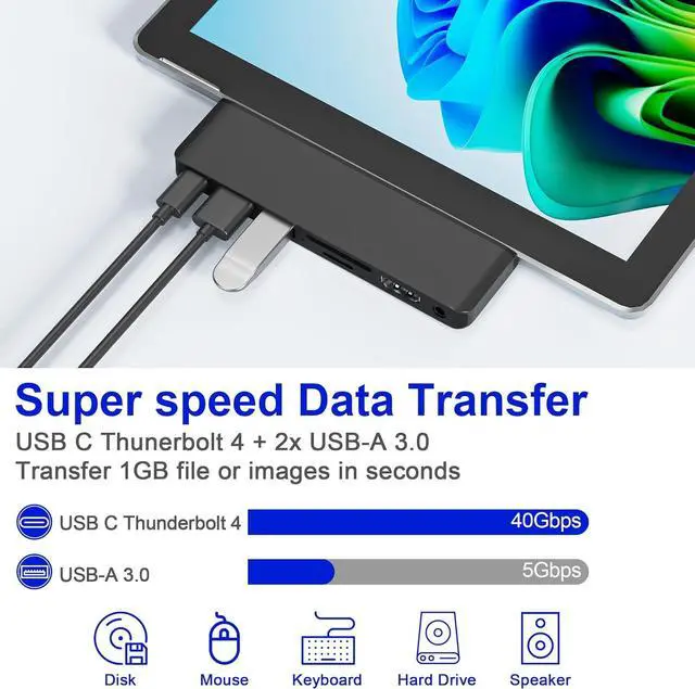 Stable and Fast Data Transfer - Surface Pro 11 dongle adapter supports data transfer through five ports: USB-C Thunderbolt 4 port supports 40Gbps light speed transmission (3 seconds to transfer a 4K movie), 2*5Gbps USB 3.0 ports, SD/TF dual-protocol card slot (UHS-II standard | 60MB/s continuous read and write, supports up to 2 TB of memory reading)