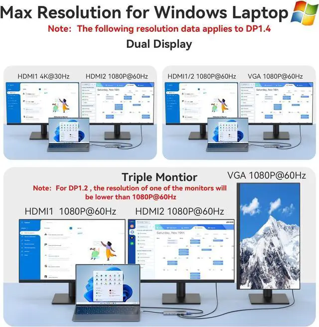 Triple Display Docking Station: The laptop docking station support mirror and extend mode, provide crystal clear 3D visual and high quality video. Single using HDMI 1 can be up to 4K@60Hz(DP 1.4 source), and single using HDMI 2 supports max up to 4K@30Hz. USB C to dual hdmi adapter connect two monitors to laptop will achieve 4K@30Hz and 1080P@60Hz(DP 1.4 ). Display output will be 1080P@60Hz when dual monitors or triple display with VGA. (