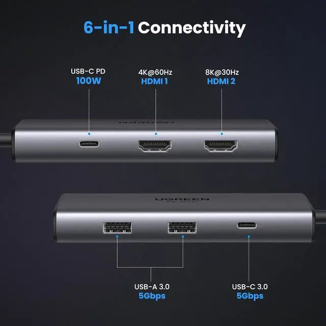 USB C Docking Station: Inspire more potential of your laptops USB-C port with two HDMI ports, a 100W USB-C PD port, a 5Gbps USB-C data port, and two USB-A data ports.