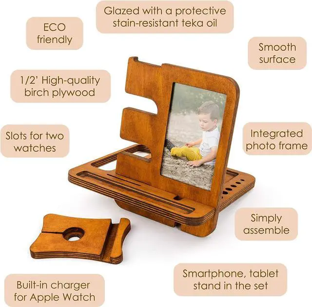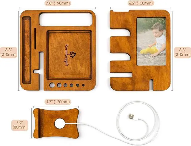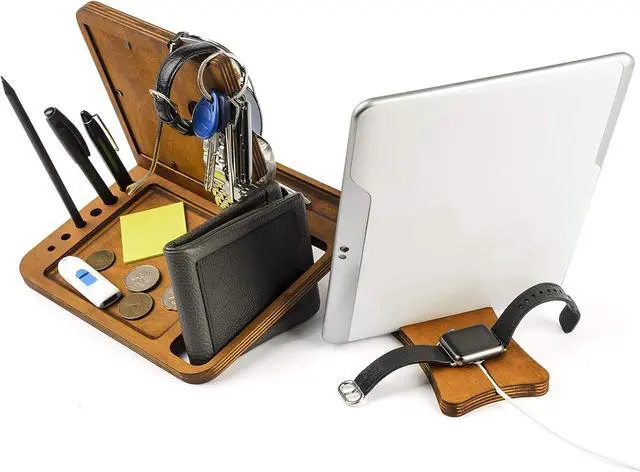 NIFTY and HANDY MEN ORGANIZER With an INTEGRATED PHOTO FRAME, space for eyeglasses, tablet stand and a built-in charger for Apple watch with a special nightstand mode, this is one of the BEST wooden docking station to cater to all your needs