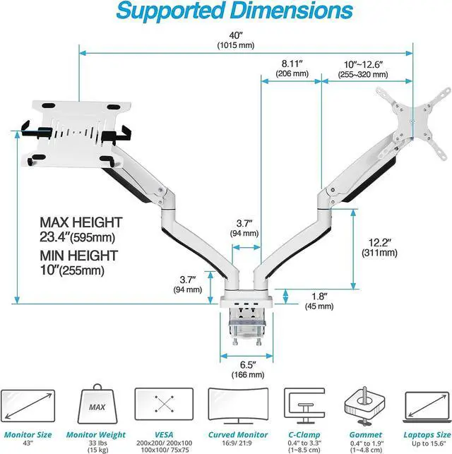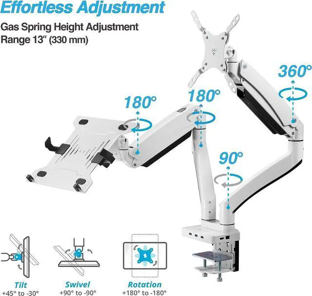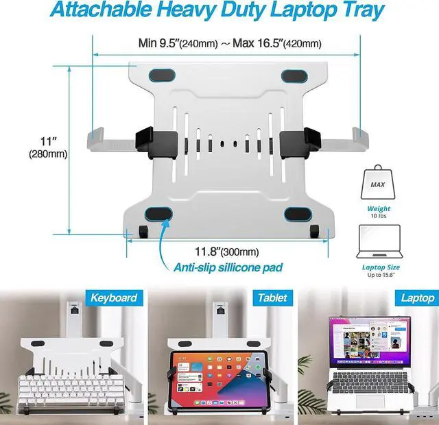 Attachable Laptop Tray - Versatile and adaptable. Use either as a dual monitor mount, or as a single monitor mount with a laptop holder to accommodate your laptop, tablet, or keyboard, providing you with optimal flexibility and functionality.