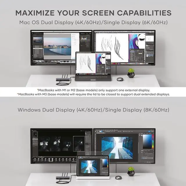 Video Output - 4K @ 60Hz dual screen, 8K @ 30Hz, or 6K on a single screen for Mac. Enjoy dual external displays with MacBook M4 models. MacBook M3 base models support dual external displays in clamshell mode. MacBook M2/M1 base models only support single external display.