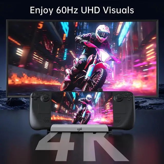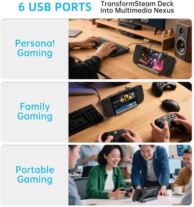 11-in-1 Handheld Console Dock:Transforms your Steam Deck OLED/ASUS ROG ALLY/Legion Go's USB Type-C into 11 ports: HDMI 2.0 (4K@60Hz), Gigabit Ethernet (1000Mbps),3 USB3.0 (5Gbps), 3 USB2.0,1 VGA1080P@60Hz,1 DP4K@60Hz, USB Type C PD 3.0 (100W),1 Key to change Screen,this handheld console dock combines hub, stand base,heat sink,40Gbps Type C adapter,4 Cpas,1 HDMI cord in 1.5M,it is a professional handheld gaming dock station.3 speed Adjustable Cooling Fans Designhis brand-new docking station can meet the needs of most gamers. You can adjust the fan speed to three different gears.Colorful LED atmosphere lights are built into both the fans and the bottom of the docking station, which can enhance your gaming experience.Stable Gigabit Ethernet & Fast Data Transmission:supports 10/100/1000BASE-T Lan networks,which could elevate your gaming to the next level with blazing-fast gigabit Ethernet, delivery unparalleled download and upload speeds for seamless online multiplayer and reduce the lag of playing games. Also,3 x USB 3.0 ports(speed up to 5Gbp),3 x USB 2.0 ports allows you transfer files and big huge games in seconds, connect to the gamepad, mouse and keyboard without any lags.4K@60Hz Output: This Gamer Docking station comes with a 4K@60Hz HDMI 2.0,When you connect an external 4K monitor,Cooling RGB Fans: Good heat dissipation not only extends the battery life of the steam deck, but also prevents other problems caused by overheat,increase the speed of cooling air entering steam deck so that heat dissipates faster.Say goodbye to the woes of system crashes or lost frames, and embrace a consistently smooth gaming experience.Widely Compatibility:Compatible with Steam Deck OLED,Steam deck,ROG Ally,Legion Go,Switch,laptop,iPad,Android,phones and other devices built-in USB C port. our this Handheld docking station redefines your Steam Deck gaming experience, allows you to project games to a larger display when you are tired of using thumbsticks or trackpads.
