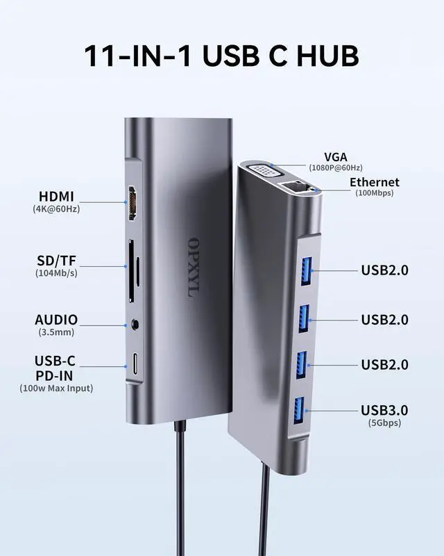 11-in-1 USB C Hub Multiport AdapterExpand your laptops USB-C port into 11 essential connections: 1×HDMI 4K@30Hz, 1×VGA 1080P, 1×USB 3.0 (5Gbps), 3×USB 2.0, 1×100W PD charging, 1×Ethernet (100Mbps), 1×SD, 1×TF, and 1×3.5mm audio jack. More ports than standard 7-in-1 or 9-in-1 hubsperfect for business, travel, and remote work.