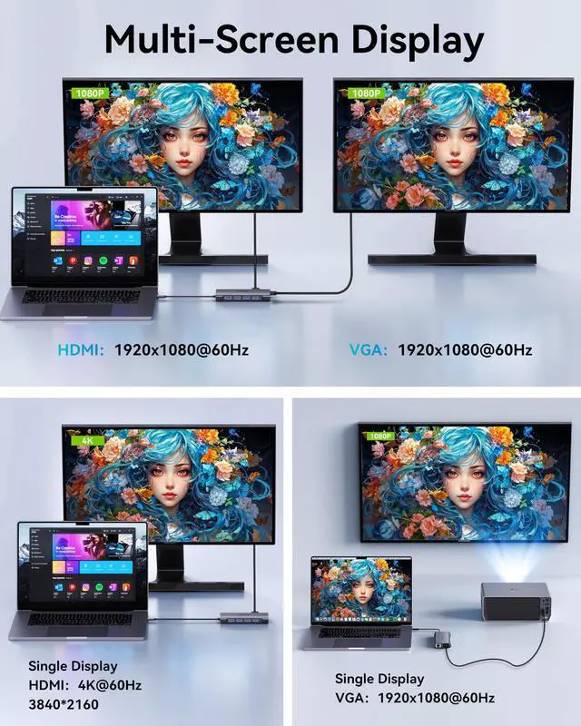 Dual Display with HDMI & VGASupports 4K HDMI output and 1080P VGA output, enabling mirror or extended screens to TVs, monitors, or projectors. Ideal for multitasking like video editing, presentations, or gaming setups. Connect HDMI + VGA simultaneously for dual-screen productivity.