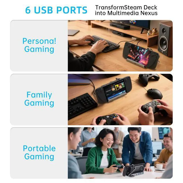 12-in-1 Handheld Console Dock:Transforms your Steam Deck OLED/ASUS ROG ALLY/Legion Go's USB Type-C into 9 ports: HDMI 2.0 (4K@60Hz), Gigabit Ethernet (1000Mbps),1 USB3.0 (5Gbps), 3 USB2.0,SD/TF, USB Type C PD 3.0 (100W),1 Key to change Screen,this handheld console dock combines hub, stand base,heat sink,40Gbps Type C adapter,4 Cpas,1 HDMI cord in 1.5M,it is a professional handheld gaming dock station.