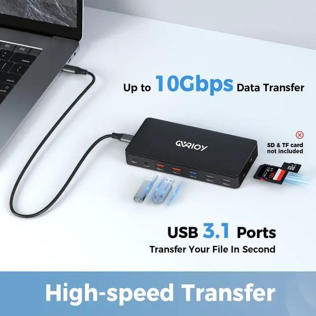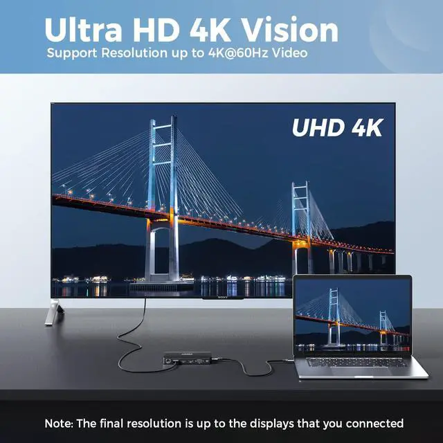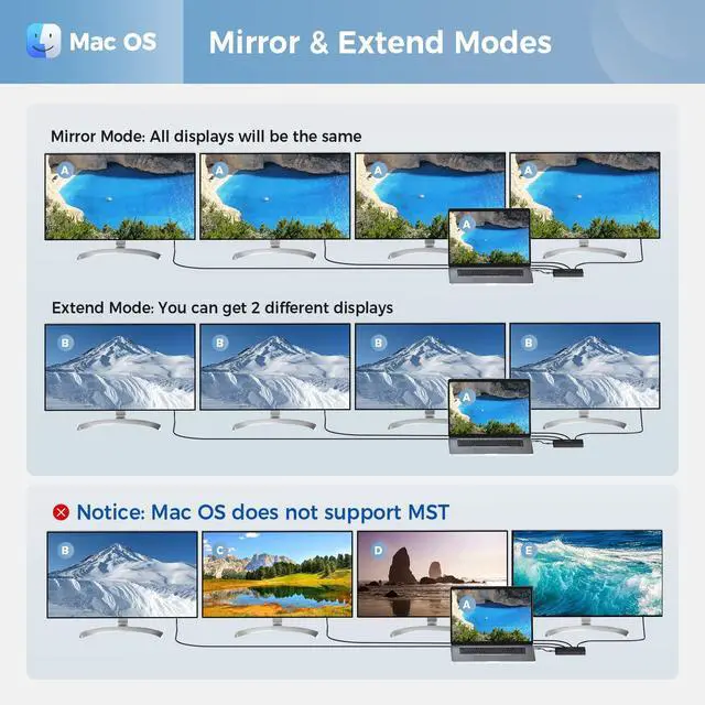 1. Connecting Mac laptop: Mac OS can't support the MST feature, so this dock will extend one image on external monitors by one full function USB-C port of your MacBook, which is different from your laptop image.