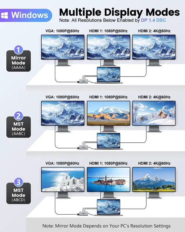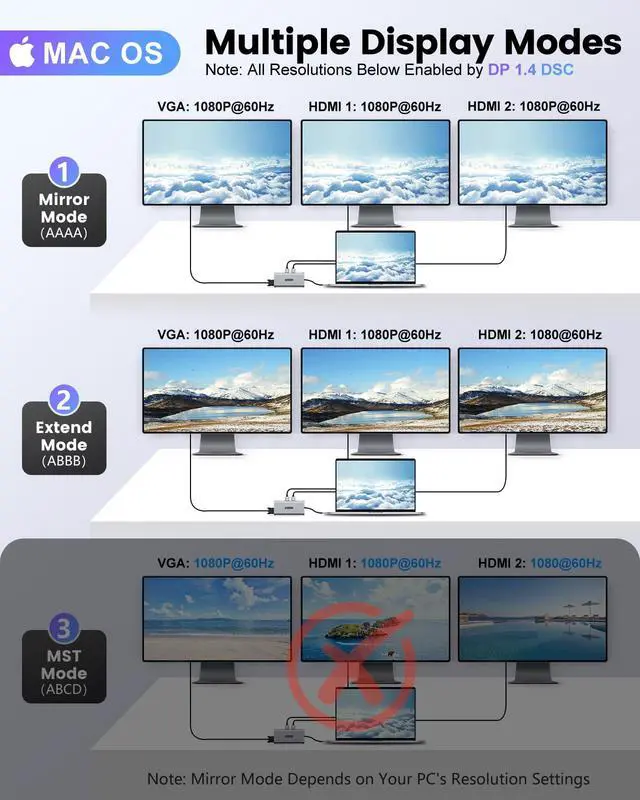 Triple Display SupportThis docking station dual monitor supports triple external display setups on Windows systems using SST and MST modes, enabling expanded screen space via HDMI and VGA outputs, with resolutions up to 4K@60Hz when using a single display. macOS supports mirror mode or extended mirror mode only. Multiple external displays will show the same content, and MST (Multi-Stream Transport) is not supported on macOS. Ideal for advanced multitasking and professional productivity environments.