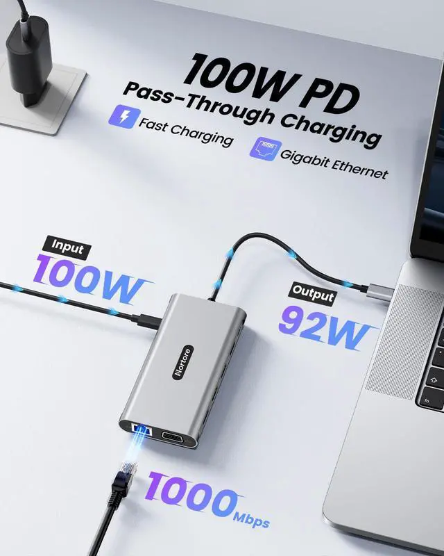 100W PD Charging & EthernetThis USB-C docking station supports up to 100W power input and delivers up to 92W output for safe laptop charging while in use. The integrated RJ45 Ethernet port provides stable wired network speeds up to 1000Mbps. Note: The PD charging port works only with devices that support the Power Delivery (PD) protocol.