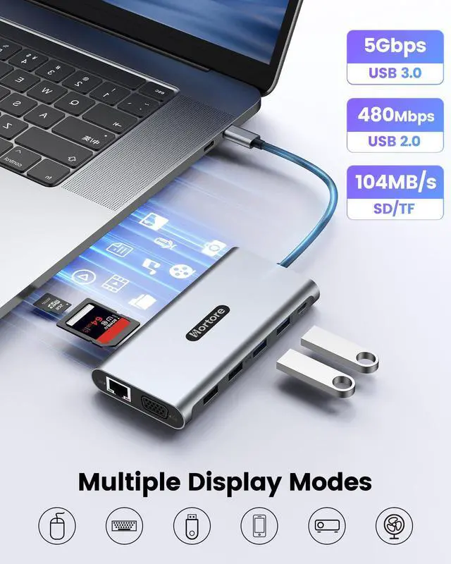High-Speed Data TransferThe built-in USB hub features USB 3.0 ports (up to 5Gbps) for fast file transfers, USB 2.0 ports (480Mbps) for stable peripherals such as keyboards and mice, and an SD/TF card reader (up to 104MB/s) for quick photo and video access.