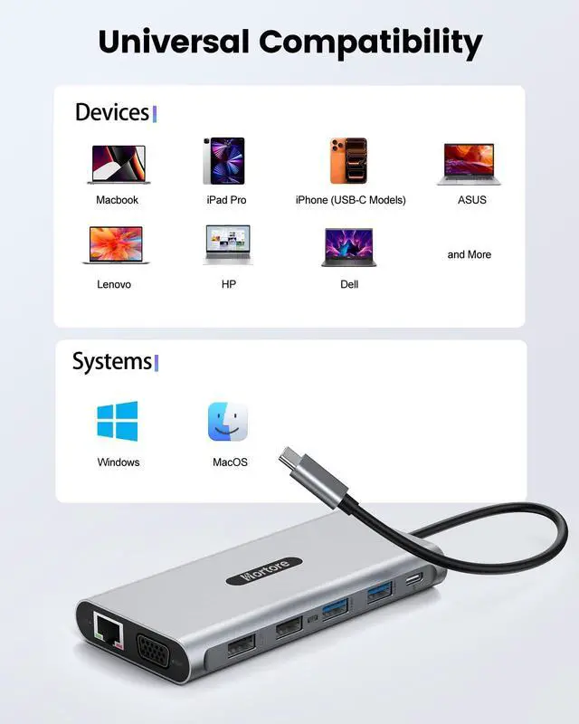 12-in-1 USB C Docking StationOne cable, seamless connectivity. This USB-C hub multiport adapter expands a single USB-C port into 2× HDMI, VGA, RJ45 Ethernet, 100W USB-C PD, USB-C data port, 2× USB 3.0, 2× USB 2.0, and an SD/TF card readeran all-in-one laptop docking station designed for daily productivity.