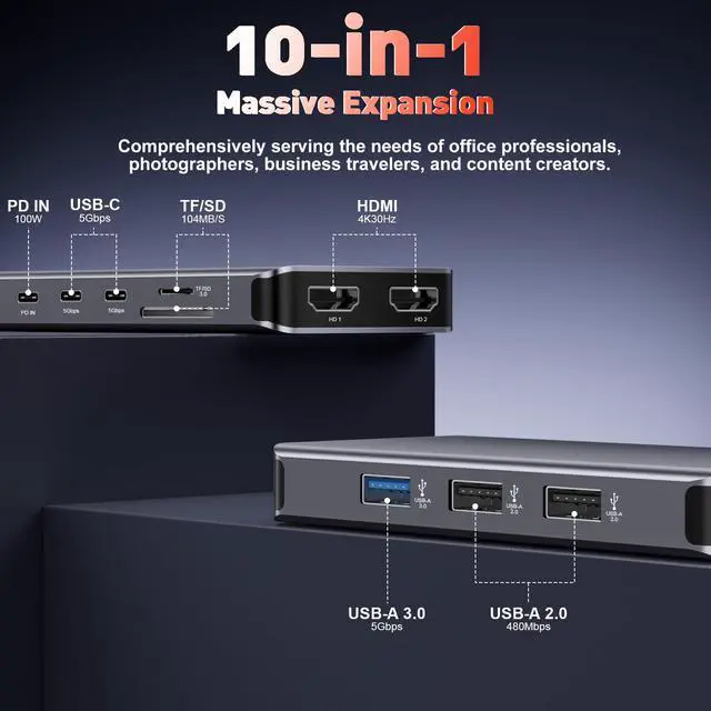 All-Round Port ExpansionThis USB C docking station expands your laptop's USB-C port to 10 practical connections in one step, meeting all business needs: 1×PD 3.0, 2×USB-C 3.0, 1×USB-A 3.0, 2×USB-A 2.0, SD/TF 3.0, and 2×4K HDMI. Seamlessly connect monitors, projectors (for meetings), hard drives (data backup) and other peripherals with one cable, creating a neat professional workspace for your laptop docking station setup and ensuring smooth meetings/office tasks