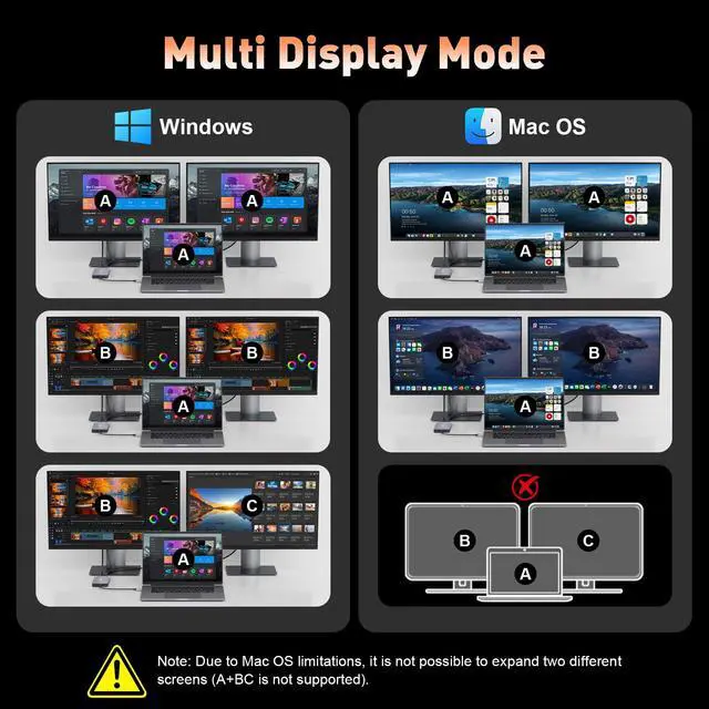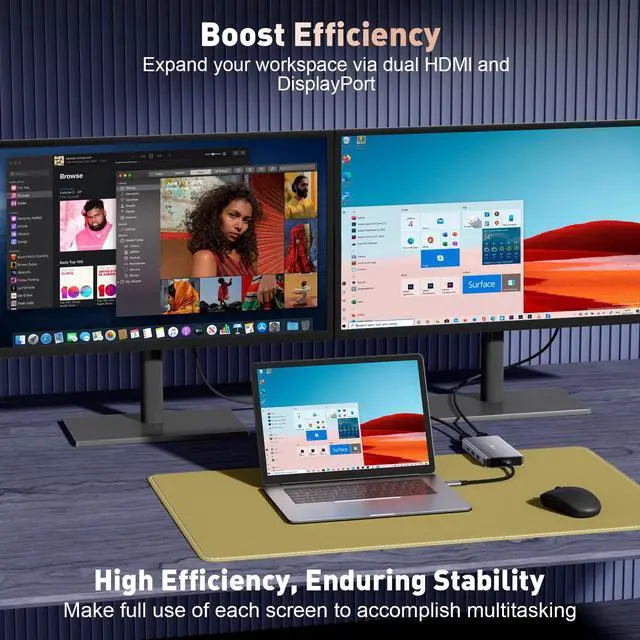 Dual HDMI DisplayThe dual 4K HDMI ports of this laptop docking station dual monitor support extend/mirror modes. Single monitor: 4K@30Hz for clear business presentations/videoconferences; dual monitors: 1080P@60Hz for multitasking. Boosts business work efficiency. Note: Windows supports extend mode; macOS only mirror mode (for team presentations)