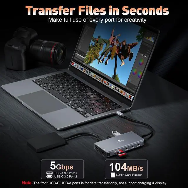 High-Speed Data Transfer2×USB-C 3.0 & 1×USB-A 3.0 of this USB C docking station support 5Gbps transfer, quickly moving large business files (proposals, video demos) in seconds for laptop dock users. 2×USB-A 2.0 (480Mbps) for lag-free connection of keyboards/mice. SD/TF 3.0 (104MB/s) enables fast import of on-site shooting materials for timely business delivery